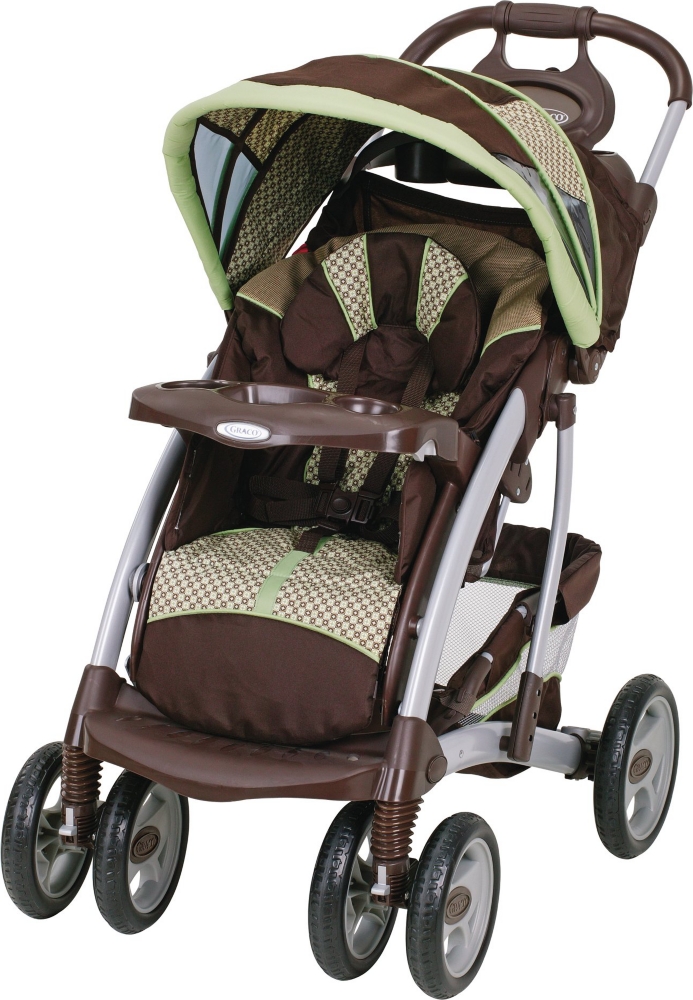 Wilson purchased a Graco Quattro Tour Deluxe Stroller and a Graco SnugRide 32 Infant Car Seat for Carter. I LOVE them!!! They are modern looking and practical. I really like the green and brown print. Remember? This is his nursery color scheme. Very matchy-matchy, which I also like. The new car seat fits snug and secure into my car. The old one shifted back and forth too much. It didn’t matter how tight I tried to strap the base in, it still moved out of place and made me very nervous. Since this new seat is also a carrier, I can lift it out of the base without having to wake the baby up. Another very wonderful thing is that it fits into the frame of my Graco Sweetpeace Infant Sooth Swing. Therefore, when I get home all I have to do is lift out the seat to the swing, place his carrier seat in and let the swing continue to rock him while he sleeps. I LOVE, LOVE, LOVE this!!! He should be able to use this new car seat until he is at least 1 years old. Other carriers have to be retired long before that because they are smaller and the baby outgrows it too fast. Another thing that I like is how the car seat carrier fits right into the stroller. Again, I do not have to wake Carter up when I transfer him. Together this car seat/stroller combination is quite the set-up. The stroller is a little bit heavy, but not as heavy as the first one I had. The previous one was so big that it took two people to lift it up, shove it into the trunk of my car and drag it back out. It was horrible and so impractical. This new Graco stroller is so easy to push, lift and fit into my car. Another plus is that there is still enough room for groceries, etc… to fit in my trunk along with the stroller.